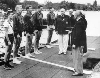 Keywords: 1948 Olympics rowing 4 with.tif en 1948 Olympic Games gold medal award ceremony for rowing in the coxed fours event for men held on August 9 on the Thames in Henley Oxfordshire England UK Recipients left to right Allen Morgan Warren Westlund Robert Martin Robert Will and Gus Giovanelli It comes from Bob Martin's scrapbook my father http //www row2k com/features/features cfm action read ID 291 Bob Martin Jr 1948-08-09 My scan of my father's photo and originally published here - http //www row2k com/features/features cfm action read ID 291 1948 Summer Olympics rowers Rowing competitions University of Washington River Thames in Oxfordshire Henley-on-Thames 1948 in rowing Olympic Games medal ceremonies |