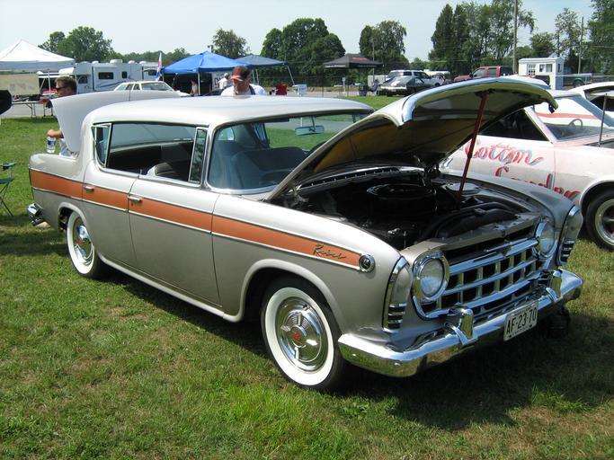 Keywords: 1957 Rambler Rebel hardtop rfu-Cecil'10.jpg en 1957 Rambler Rebel a mid-sized muscle car built by American Motors Corporation AMC A limited edition four-door hardtop no center pillar model designed to showcase AMC's new high-performance 327 cu in 5 4 L V8 engine Picture taken at the Cecil County Dragstrip in Maryland own 2010-07-18 CZmarlin ” Christopher Ziemnowicz releases all rights but a photo credit would be appreciated if this image is used anywhere other than Wikipedia Please leave a note at Wikipedia http //en wikipedia org/w/index php title User_talk CZmarlin action edit section new here Thank you en I the copyright holder of this work hereby release it into the public domain This applies worldwide thumb left Right front view of AMC's 1957 muscle car thumb center The AMC 327 four-barrel V8 engine in this Rambler Rebel thumb left Driver's view of the dashboard thumb center Interior view of cockpit and dashboard thumb left R Emblem on the gas cap rear left fender and the gold body side trim thumb center Detail of the Rebel emblem on front fender and the gold body side trim thumb left The Rebel emblem on the trunk lid and detail of the tail lamp on this Rambler Rebel thumb center Head on view thumb left Detail of the four-door hardtop pillarless body design thumb center Passenger area in the Rambler Rebel thumb left Detail of the full wheel cover with spinner and correct vintage whitewall tires on this Rambler Rambler Rebel 1957 AMC automobiles |