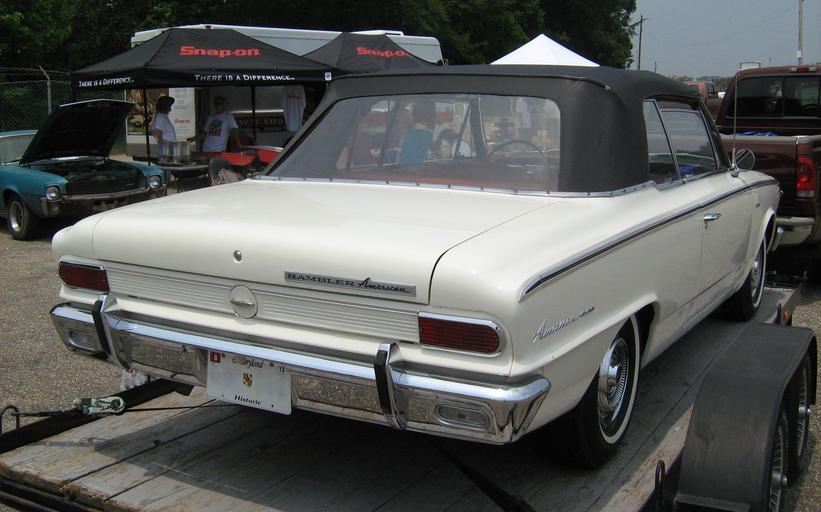 | Keywords: 1965 Rambler American 440 convertible white mdD-2.jpg en 1965 Rambler American 440 convertible - a compact car produced by American Motors Corporation AMC This white two-door ragtop features AMC's entirely new 232 cu in 3 8 L straight-6 engine that AMC would use through 1979 and then continue being built through 2006 in different displacements including the 4 0 L Jeep engine under AMC and later Chrysler Photograph taken in the vendor's area at Potomac Ramblers Club's 2011 all AMC Drag Race Day held at the Capitol Raceway located in Crofton Maryland own 2011-06-11 CZmarlin ” Christopher Ziemnowicz releases all rights but a photo credit would be appreciated if this image is used anywhere other than Wikipedia Please leave a note at Wikipedia http //en wikipedia org/w/index php title User_talk CZmarlin action edit section new here Thank you thumb left Front right side view thumb center Driver's cockpit dashboard individually adjustable reclining seats thumb left Front end and grill design with factory optional bumper guards thumb center Rear end view with factory optional bumper guards thumb left The Rambler American badge on trunk lid thumb center The American 440 badge on rear fender 1965 AMC automobiles White convertibles Rambler American third generation |
