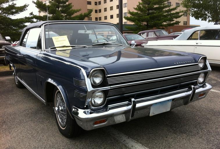 | Keywords: 1966 AMC Ambassador 990 4-sp convertible AACA Iowa a.jpg 42 028833333333 -91 651833333333 en 1966 AMC Ambassador 990 convertible finished in blue - front right side view A full-sized automobile built by American Motors Corporation AMC in Kenosha Wisconsin This is an all original one-owner car that was special ordered by them Among the features on this car are its 327 cu in 5 4 L 4--barrel carb V8 engine with a 4-speed manual transmission center console mounted shifter with black bucket seats as well as an AM/FM radio and an aftermarket 8-track stereo player Picture taken at the 2012 Antique Automobile Club of America AACA Central Spring meet in Cedar Rapids Iowa USA 2012-06-23 14 31 37 own CZmarlin ” Christopher Ziemnowicz releases all rights but a photo credit would be appreciated if this image is used anywhere other than Wikipedia Please leave a note at Wikipedia http //en wikipedia org/w/index php title User_talk CZmarlin action edit section new here Thank you thumb left Left side front view thumb center Right rear view thumb left Rear view thumb center Right side view thumb left Front view thumb center Interior view thumb left Driver's compartment thumb center Interior view thumb left Left side of engine thumb center Right side of engine thumb left Front view thumb center Headlamp detail thumb left Model name and wheel detail thumb center Right front view thumb left upright Tail lamp detail cc-zero Uploaded with UploadWizard AMC Ambassador 1966 AMC automobiles Blue convertibles Automobiles facing right |