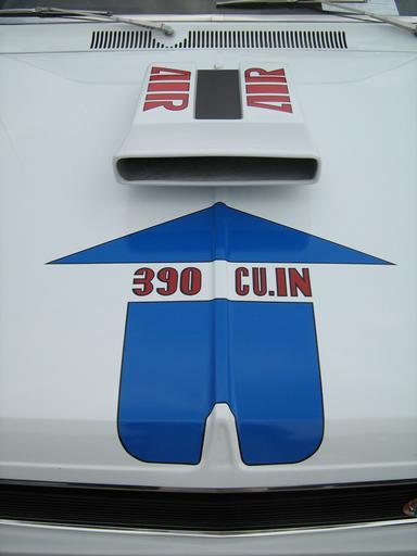 Keywords: 1969 AMC SC-Rambler md-D4.jpg en Detail of the standard functional hood scoop on the 1969 SC/Rambler - a compact two-door hardtop muscle car produced by American Motors Corporation AMC in collaboration with Hurst Performance This two-door hardtop body style no B pillar was a special low-priced factory-ready Stock Car model designed to to showcase AMC in performance and drag racing Each Hurst SC/Rambler came equipped with AMC's 315 hp 235 kW; 319 PS 390 cu in 6 4 L AMC V8 engine from the AMX and only with a four-speed manual transmission with Hurst shifter as well as a standard 3 54 1 Twin-Grip limited slip differential This car has the A paint scheme Photograph taken at Potomac Ramblers Club's 2011 all AMC Drag Race Day held at the Capitol Raceway an NHRA sanctioned 1/4 mile asphalt and concrete drag strip located in Crofton Maryland own 2011-06-11 CZmarlin ” Christopher Ziemnowicz releases all rights but a photo credit would be appreciated if this image is used anywhere other than Wikipedia Please leave a note at Wikipedia http //en wikipedia org/w/index php title User_talk CZmarlin action edit section new here Thank you thumb left Front right side view thumb center Driver's cockpit and dashboard with the factory standard Sun brand tachometer strapped to the steering column thumb left Detail of standard rear view mirror thumb center Returning from a run down the drag strip thumb left The SC/Rambler's standard red/white/blue headrests on individually adjustable reclining front seats AMC SC/Rambler Hood scoops |