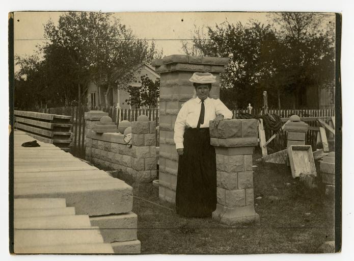 Keywords: Mrs. E. M. Barrett in her concrete block work yard austintexas