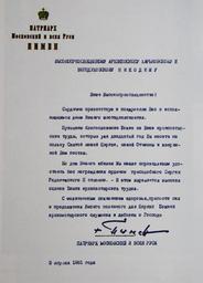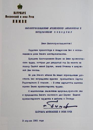 | Keywords: Никодим орден Сергия 1981 подпись Пимена.JPG аг адной лист Пат иа ха осковского и Всея Руси Пимена а хиепископу икодиму Руснаку осква СССР 1981 год Печатная машинка с тёмно-синей лентой own photo 1981-04-03 РПЦ / Пат иа х Пимен подпись не факсимиле / Текст станда тный PD-trivial text Russia signature photo Patriarch Pimen Signatures of bishops of the Russian Orthodox Church Sergius of Radonezh Nikodim Rusnak | ||||