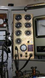 Keywords: 19 Bathyscaph Trieste German Museum Munich.jpg Bathyscaph Trieste German Museum Munich 1 Schalttafel für die Außenbeleuchtung 3 Scheinwerfer Quecksilberdampflampen an der Unterseite des Schwimmkörpers und 2 Glühlampen in Stahlgehäusen am Beobachtungsfenster der Tauchkugel und im Vorzimmer Ateliers de Constructions Mécaniques de Vevey S A Vevey Schweiz 2 Schalttafel zur Betätigung der Ballastschleusen und anderen Einrichtungen Ateliers de Constructions Mécaniques de Vevey S A Vevey Schweiz 3 Schalttafel für die Antriebsmotoren Ateliers de Constructions Mécaniques de Vevey S A Vevey Schweiz 4 Reservematerial 5 Chronometer des Fabrikats wie es auch bei den Ballonflügen in die Stratosphäre 1931 und 1932 von Auguste Piccard benutzt wurde Ateliers de Constructions Mécaniques de Vevey S A Vevey Schweiz 6 Totalisator zur Kontrolle der Ballastabgabe Mit zwei Sekunden-Zählwerken die nur laufen wenn der Strom der zugehörigen Ballastschleuse unterbrochen ist und Ballast abgegeben wird Da der Ballastausfluß jeder Schleuse ziemlich genau 10 kg je Sekunde beträgt kann man sofort erkennen wie viel Ballast verbraucht worden ist Langines Compagnie des Mantres Longines Francillon S A St Imier Schweiz 7 Manometer die zur Ermittlung der Tauchtiefe den Wasserdruck messen Haenni Jegenstorf Schweiz 8 Hochdruckventil 1200 kp/qcm Maschinenfabrik Burckhardt Aktiengesellschaft Basel Schweiz 9 Wasserdichter und explosionsgeschützter Fernsprechapparat für Batteriebetrieb mit einer Buchse im Schwimmkörper so dass nach dem Auftauchen eine Kabelverbindung mit Begleitfahrzeugen hergestellt und so beim Tauchen bis in geringe Tiefen aufrechterhalten werden kann Società Italiana Telecomunicazioni Siemens s p a Milano Italien 10 Automatische Filmkamera Bolex H 16 Reflex Paillard S A Ste Croix Schweiz 11 Photographische Kamera Exakta Ihagee Kamerawerk A G Dresden 12 Anzeigeinstrument des Nickelwiederstandsthermometers zur Messung der Temperatur des Tragebenzins Bosco Co S p a Torino Italien 13 Pendel zur Bestimmung der Trimmlage 14 Zink-Silber-Akkumulatoren zum Betrieb elektrischer Geräte der Ballastschleusen der Haltemagnete der Antriebsmotoren der Ventilatoren der Scheinwerfer Lampen und Innenbeleuchtung 330 Zellen zu je 1 5 Volt Electrona S A Boudry Schweiz 15 Pressluftflaschen zum Ausblasen des Wassers aus Vorzimmer und Einsteigeschacht AGA A G Pratteln-Zürich-Genf 16 Sauerstoff-Flaschen der Belüftungsanlage um den Sauerstoffgehalt der Atemluft in der Tauchkugel zu erneuern AGA A G Pratteln-Zürich-Genf 17 Natronpatronen Aus den Druckflaschen in einem Injektor strömender Sauerstoff saugt Raumluft durch diese drei Patronen Kohlendioxyd wird absorbiert und die gereinigte Luft gelangt gemischt mit Sauerstoff im Kreislauf in die Kabine zurück Drägerwerk Lübeck 18 Schalttafel Ateliers de Constructions Mécaniques de Vevey S A Vevey Schweiz 19 Unterwassertelefon nach Russel Lewis Laboratorium für Unterwasserschall New London Connecticut USA mit dem auch während des Tauchens eine Sprech- oder Signalverbindung mit dem Begleitschiff aufrechterhalten werden kann Die beim Sprechen auf das Mikrofon auftreffenden Schallwellen werden im Bereich von 300 bis 3000 Hertz in elektrische Schwingungen und nach Verstärkung zur à bertragung im Wasser in Unterschallschwingungen von 8387 bis 11087 Hertz umgewandelt Einseitenband-Modulation mit unterdrücktem Träger Beim Empfang findet der umgekehrte Vorgang statt 20 Echolot 21 Log zum messen der Vertikalgeschwindigkeit 22 Innenbeleuchtung mit 6 kleinen Glühlampen zur Beobachtung der Instrumente Sie beleuchten die weiß gestrichene Decke der Tauchkugel und sind gegen die Besatzung abgeschirmt um Blendwirkung zu vermeiden 23 Traggerüste für die Geräteausstattung Verformungen der Kugel durch Temperaturänderungen werden von Schraubfedern aufgenommen die in Bohrungen am oberen Ende der Stangen sitzen und einen Messingkolben gegen die Kugelwand drücken Ateliers de Constructions Mécaniques de Vevey S A Vevey Schweiz 24 Sitze 25 Fußboden der den Keller abdeckt Im Keller werden Alkalipatronen zur Erneuerung der Atemluft Druckgasflaschen zum Ausblasen des Einsteigschachtes nach einer Tauchfahrt und anderes Reservematerial aufbewahrt 26 Tauchkugel Fried Krupp Essen 27 Einsteigeluke 28 Hauptbeobachtungsfenster 29 Tonbandgerät Kudelski Enregistreur autonomes Nagra Paudex-Lausanne own Reinraum 2010-09-19 Trieste submarine 1953