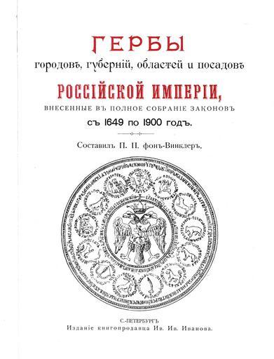 Keywords: 1 Титул книги Винклера1900. Бол.печать Ив.Грозного.jpg Title page of Gerbovnik Vinklera Титульный лист Ге бовника Винкле а Изоб ажена Большая госуда ственная печать Ивана Г озного с ге бами П П фон-Винкле Ге бы го одов губе ний областей и посадов Российской Импе ии внесенные в Полное Соб ание законов с 1649 по 1900 год Дозволено цензу ою С -Пете бу г 20 Июля 1899 года Издание книгото говца Ив Ив Иванова С -Пете бу г Типог афия И Комелова П яжка д 3 1899 \ Scanned by Vizu 1899 П П фон Винкле \ Pavel von Vinkler PD-old-70 PD-RusEmpire <references/> File Бол печать Ивана Г озного jpg Gerbovnik Vinklera - Pages 1 1899 Seals of Ivan IV
