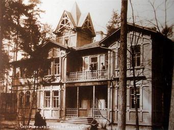 Keywords: Лесная1Сосновая.JPG ru Фотог афия к аеведа памятника а хитекту ы в г Сест о ецке СПб на ул Сосновой д 2 Early 20th century photograph of a house at 2 Sosnovaya Street Sestroretsk own Пёт Иванов photo of photograph ; unknown author original photo ; exhibited with caption from the collection of V S Renni Beginning of 20th century retouched NVO Perspective trim contrast de-saturated PD-RusEmpire Dachas Buildings in Sestroretsk Wooden architecture in Leningrad Oblast