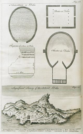 View Original:1 Naumachium in Delos 2 Portico in Delos 3 Fragment of a stone in Delos 4 Theater in Delos 5 Superficial survey of the i - Drummond Alexander - 1754.jpg (937x1500)