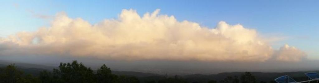Keywords: At around dawn from the summit I could see a long cumulonimbus cloud moving slowly up St Vincent's Gulf. It has a very flat base, and is not a classic tall anvilled "coldie". Perhaps a similar kind of cloud produced the snow shower a bit later. Camera time 710am. A four photo panorama. snow mtlofty southaustralia 10thaugust2008 milespeachfield |