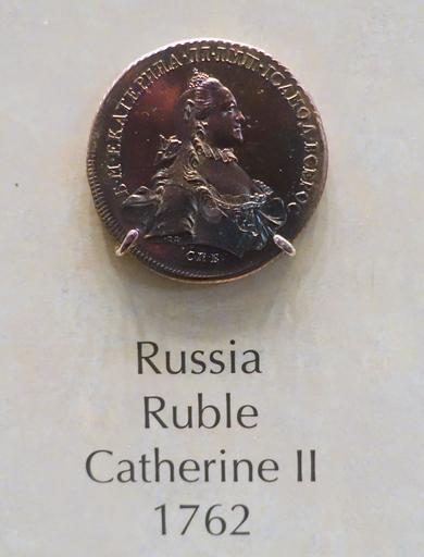 Keywords: 1 Ruble, Russia, Catherine II, 1762 - National Museum of American History - DSC00274.jpg en Exhibit in the National Museum of American History Washington DC USA Photography was permitted in the museum without restriction 2015-03-27 11 38 03 own Daderot other versions cc-zero Coins in the National Museum of American History 1 ruble Catherine II of Russia on coins |