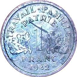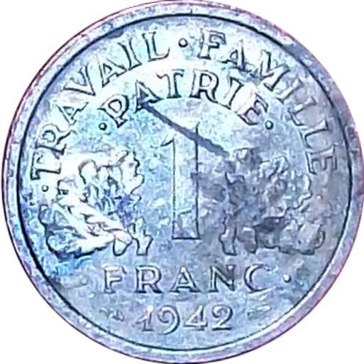 Keywords: 1 Vichyfrance 1942 RS.png en French Coin value of 1 Franc dating to 1942 Vichy France Reverse Side Caption travail famille patrie franc 1942 Symbol digit 1; oak leaf branches Cereals de Französische Münze mit dem Wert von einem 1 Franc von 1942 Vichy Regime Rückseite Legende travail famille patrie franc 1942 Bild Zahl 1; Eichenlaub own McGoinz Vorderseite-Front Side ImageNote 1 220 160 92 91 371 370 2 Oak leafs flanking the digit ImageNoteEnd 1 ImageNote 2 27 41 313 108 371 370 2 The motto of Vichy-France Travail Famille Patrie Work Family Fatherland ImageNoteEnd 2 1942 coins 1942 in France Coins of Vichy France |