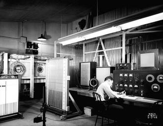 Keywords: blackandwhite monochrome indoor black and white (A-6245): This view of the 1 x 3.5-Foot High-Speed Tunnel’s test chamber shows its test section (L background), controls (R), and portable multi-tube manometer panels with a camera stand in the foreground. (A-6245): This view of the 1 x 3.5-Foot High-Speed Tunnel’s test chamber shows its test section (L background), controls (R), and portable multi-tube manometer panels with a camera stand in the foreground.