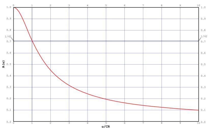 | Keywords: 1st Order Lowpass Filter ARF Lin.svg The amplitude response function of the following 1st-Order Lowpass Filter centre Plotted on linear-linear scales from 0 to 10 units of RC Own drawing Plotted in Mathematica Edited in Inkscape 2007-02-17 Inductiveload Logarithmic Amplitude Response Function Linear Phase Response Function Logarithmic Phase Response Function Mathematica Source This code requires the following packages to be loaded <pre><<Graphics`Graphics`</pre> <pre> lingrid0pos1 Tablea a 0 1 0 1 ; lingrid0pos10 Tablea a 0 10 1 ; root2 1/Sqrt2 ; linxgrid lingrid0pos10; linygrid Unionlingrid0pos1 root2; ampplotlin Plot1/Sqrt1 + ω 2 ω 0 10 PlotRange -> 0 10 0 1 ImageSize -> 800 Frame -> True GridLines -> linxgrid linygrid FrameTicks -> linxgrid linygrid FrameLabel -> ω/CR A ω </pre> Analog signal processing circuit diagrams |