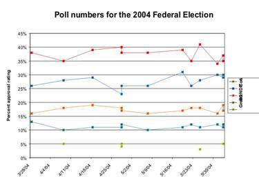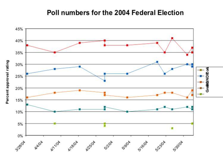 | Keywords: 2004 canadian election approval ratings June 2.png  Approval ratings percentages for the 2004 Canadian federal election created by Nicholas Moreau public domain Note I'll fix the legend in future versions but the parties are Liberal red Conservatives pure blue NDP orange the Bloc grey blue and the Green Party leafy green en wikipedia 2004-06-03 Zanimum wikipedia en Zanimum 2004-12 original upload log page en wikipedia 2004_canadian_election_approval_ratings_June_2 png 2004-06-03 15 06 Zanimum 680×465× 40403 bytes <nowiki>Approval ratings percentages for the 2004 Canadian federal election created by Nicholas Moreau public domain</nowiki> Images moved from Wikipedia by Captain-tucker Approval ratings Canadian federal election 2004 Opinion polls in Canada |