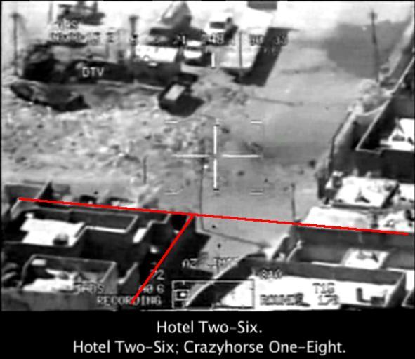 Keywords: 2007-07-12 sun measurement.png Gun camera footage of the airstrike of 12 July 2007 in Baghdad showing the slaying of Namir Noor-Eldeen and a dozen other civilians by an US helicopter One frame from 5 00 of this video has been used to measure the position of the sun The red lines should mark due east-west and due north-south From examination of the Google Earth version of the map at the coordinates given in the Wikipedia article it appears clear that the scene is being viewed from the north Measurements taken were that the east-west line was +540x +50y; the north-south line was -85x +121y; and the telephone pole shadow was +87x +23y where x y are pixels from the upper left corner These were calculated to mean that the angle of the pole was at tan-1 0 15 and that the sun is 8 5 degrees south of due east Using this angle the equation of time to subtract 6 minutes from the local time and the longitude of Baghdad to subtract 2 minutes to make it a UTC+3 local time zone I calculated a time of 6 26 a m not counting daylight savings time The footage reads 06 23 22 On this basis I believe the helicopter footage is in local time not in GMT standard time Note that this conflicts with the U S Army report see http //en wikipedia org/wiki/Talk July_12 _2007_Baghdad_airstrike Inaccurate_time Note that this original research cannot be cited or used in the Wikipedia article by itself but supports a search for other sources July_12 _2007_Baghdad_airstrike_unedited_part1 ogv 2010-04-09 23 25 UTC July_12 _2007_Baghdad_airstrike_unedited_part1 ogv US Apache helicopter derivative work Wnt <span class signature-talk >talk</span> PD-USGov original upload log This image is a derivative work of the following images File July_12 _2007_Baghdad_airstrike_unedited_part1 ogv licensed with PD-USGov 2010-04-08T06 36 12Z Mahanga 720x576 90341681 Bytes <nowiki> Gun camera footage of the airstrike of 12 July 2007 in Baghdad showing the slaying of Namir Noor-Eldeen and a doze</nowiki> Uploaded with derivativeFX July_12 _2007_Baghdad_airstrike_unedited_part1 ogv US Government Crazyhorse 18 with lines marked by Wnt 2007-07-12 PD-USGov Baghdad 2007-07-12 airstrike pictures |