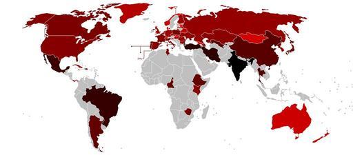 | Keywords: 2008 Summer Olympics capita per gold medal.PNG en Map of the world showing for each country the relative capita per gold medal value Gray countries don't have received any gold medal The color for the remaining countries ist red which means in HSV Hue 0 Saturation 100 Value x The value x is calculated the following way Let C/G be the Capita per Gold medal ratio Then -R is ln C/G -ln max C/G Logarithmic of C/G And finally x is R/max R 100 Transferred from http //en wikipedia org en wikipedia; transferred to Commons by User Cloudbound using http //bots wmflabs org/~richs/commonshelper php CommonsHelper on Labs 2008-08-25 Toscho at http //en wikipedia org en wikipedia en wikipedia Toscho Original upload log page en wikipedia 2008_Summer_Olympics_capita_per_gold_medal PNG 2008-08-25 22 06 Toscho 1425×625× 33309 bytes <nowiki>Map of the world showing for each country the relative capita per gold medal value Gray countries don't have received any gold medal The color for the remaining countries ist red which means in HSV Hue 0 Saturation 100 Value x The value x is calc</nowiki> 2008 Summer Olympics maps |
