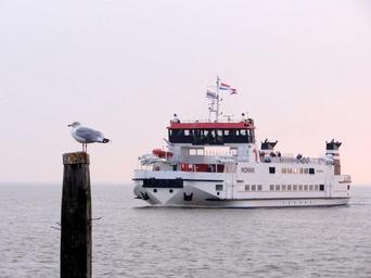 Keywords: 20101005 Monnik Schiermonnikoog.jpg De veerboot Monnik veerdienst Lauwersoog-Schiermonnikoog bij Schiermonnikoog own 2010-10-05 Gouwenaar Schiermonnikoog ferry Lauwersoog Monnik ship 1985 Larus argentatus incidental Cc-zero