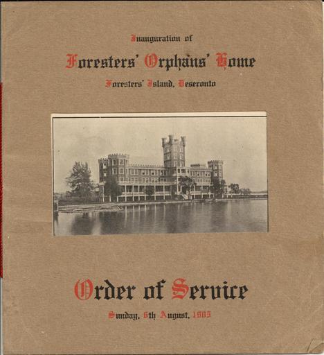 | Keywords: 1900s orphanage independent order of foresters independentorderofforesters text Front cover of order of service for the inauguration of the Foresters' Orphans' home, Foresters' Island, Deseronto, Ontario, Sunday 6th August, 1905. Front cover of order of service for the inauguration of the Foresters' Orphans' home, Foresters' Island, Deseronto, Ontario, Sunday 6th August, 1905. |