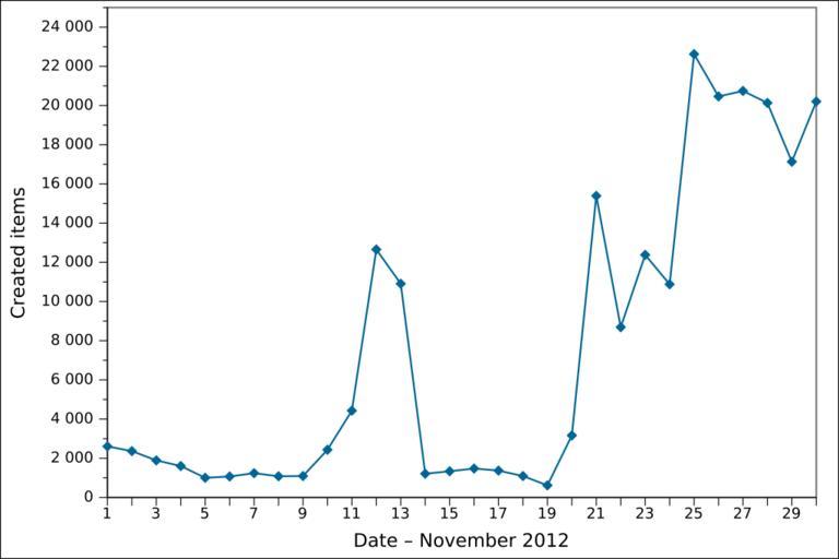 | Keywords: 2012-11 Wikidata item creation EN.svg de Grafische Darstellung des täglichen Anzahls der in November 2012 angelegten Gegenstände auf Wikidata auf Englisch Löschungen werden nicht berücksichtigt en Graph presenting the number of items created daily on Wikidata in November 2012 in English Item deletions are not taken into account fr Graphique en anglais représentant le nombre d'éléments créés par jour sur Wikidata en novembre 2012 Les suppressions d'éléments ne sont pas prises en compte 2012-12-05 12 45 48 own Ljubinka cc-zero de inline yes File 2012-11 Wikidata item creation DE svg fr inline yes File 2012-11 Wikidata item creation FR svg Wikidata statistics in November 2012 Wikidata statistics in English |