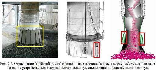 Keywords: Обеспыливание 2012 Рис. Рис. 7.4. Ограждение и поворотные датчики.jpg ru Иллюст ация к учебнику по обеспыливанию п и добыче и пе е аботке полезных мине альных ископаемых глава 7 а Рис 7 4 показано ог аждение и датчики установленные на конце выг узного п испособления и используемые для его постепенного своев еменного подъёма для уменьшения пылеоб азования en Figure 7 4 Skirt in yellow box and tilt sensors in red boxes installed on the discharge end of loading spouts to help reduce dust emissions 2015-02-06 http //www cdc gov/niosh/mining/works/coversheet1765 html Dust Control Handbook for Industrial Minerals Mining and Processing CDC 2012 Andrew B Cecala Andrew D O Brien Joseph Schall et al other versions Рис 7 4 Ог аждение в жёлтой амке и пово отные датчики в к асных амках установленные на конце уст ойства для выг узки мате иала и уменьшающие попадание пыли в воздух PD-USGov Workplace safety Uploaded with UploadWizard