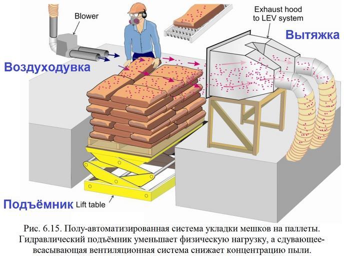 Keywords: Обеспыливание 2012 Рис. 6.15. Полу-автоматизированная система укладки мешков.jpg ru Иллюст ация к учебнику по обеспыливанию п и добыче и пе е аботке полезных мине альных ископаемых глава 6 а Рис 6 15 показана Рис 6 15 полу-автоматизи ованная система укладки мешков на опо у поднимаемую гид авлическим подъёмником В течение всего в емени пог узки высота ве хней пове хности мешков остаётся постоянной Сдувающе-всасывающая вентиляция нап авляет запылённый воздух в зонт местного вентиляционного отсоса находящийся на п отивоположной от сопел сто оне en Figure 6 15 Semi-automated bag palletizing system to ergonomically improve bag stacking process with a push-pull ventilation system used to capture the dust generated 2015-02-06 http //www cdc gov/niosh/mining/works/coversheet1765 html Dust Control Handbook for Industrial Minerals Mining and Processing CDC 2012 Andrew B Cecala Andrew D O Brien Joseph Schall et al other versions Рис 6 15 Полу-автоматизи ованная система укладки мешков на паллеты Гид авлический подъёмник уменьшает физическую наг узку а сдувающее-всасывающая вентиляционная система снижает концент ацию пыли PD-USGov Workplace safety Uploaded with UploadWizard |