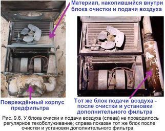 Keywords: Обеспыливание 2012 Рис. 9.6. Влияние техобслуживания и очистки на эффективность.jpg ru Иллюст ация к учебнику по обеспыливанию п и добыче и пе е аботке полезных мине альных ископаемых глава 9 а Рис 9 6 показан блок очистки и подачи воздуха слева у кото ого не п оводилось егуля ное техобслуживание; а сп ава показан тот же блок после очистки и установки дополнительного фильт а en Figure 9 6 Filtration unit showing lack of maintenance and care left side and after cleaning and the addition of a new intake air filtration unit right side 2015-02-14 http //www cdc gov/niosh/mining/works/coversheet1765 html Dust Control Handbook for Industrial Minerals Mining and Processing CDC 2012 Andrew B Cecala Andrew D O Brien Joseph Schall et al other versions Рис 9 6 У блока очистки и подачи воздуха слева не п оводилось егуля ное техобслуживание; сп ава показан тот же блок после очистки и установки дополнительного фильт а PD-USGov Workplace safety Uploaded with UploadWizard