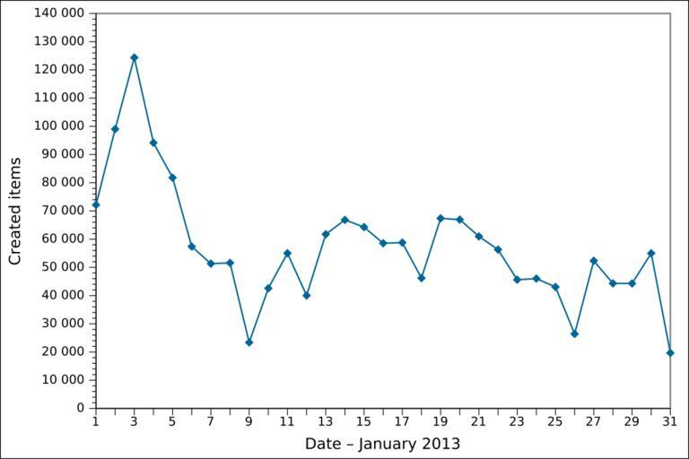 | Keywords: 2013-01 Wikidata item creation EN.svg de Grafische Darstellung des täglichen Anzahls der in Januar 2013 angelegten Gegenstände auf Wikidata auf Englisch Löschungen werden nicht berücksichtigt en Graph presenting the number of items created daily on Wikidata in January 2013 in English Item deletions are not taken into account fr Graphique en anglais représentant le nombre d'éléments créés par jour sur Wikidata en janvier 2013 Les suppressions d'éléments ne sont pas prises en compte 2013-02-01 16 45 00 own Ljubinka cc-zero de inline yes File 2013-01 Wikidata item creation DE svg fr inline yes File 2013-01 Wikidata item creation FR svg Wikidata statistics in January 2013 Wikidata statistics in English |