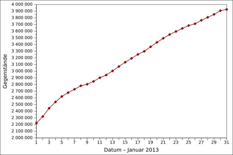 Keywords: 2013-01 Wikidata items DE.svg de Grafische Darstellung des vollständigen Anzahls der angelegten Gegenstände auf Wikidata in Januar 2013 auf Deutsch Löschungen werden nicht berücksichtigt en Graph presenting the total number of items created on Wikidata as of January 2013 in German Item deletions are not taken into account fr Graphique en allemand représentant le nombre total d'éléments créés sur Wikidata en janvier 2013 Les suppressions d'éléments ne sont pas prises en compte 2013-02-01 16 44 00 own Ljubinka cc-zero en inline yes File 2013-01 Wikidata items EN svg fr inline yes File 2013-01 Wikidata items FR svg Wikidata statistics in January 2013 Wikidata statistics in German