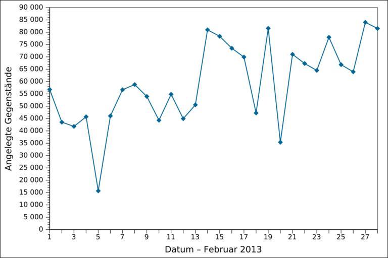 Keywords: 2013-02 Wikidata item creation DE.svg de Grafische Darstellung des täglichen Anzahls der in Februar 2013 angelegten Gegenstände auf Wikidata auf Deutsch Löschungen werden nicht berücksichtigt en Graph presenting the number of items created daily on Wikidata in February 2013 in German Item deletions are not taken into account fr Graphique en allemand représentant le nombre d'éléments créés par jour sur Wikidata en février 2013 Les suppressions d'éléments ne sont pas prises en compte 2013-03-01 16 08 own Ljubinka cc-zero en inline yes File 2013-02 Wikidata item creation EN svg fr inline yes File 2013-02 Wikidata item creation FR svg Wikidata statistics in February 2013 Wikidata statistics in German