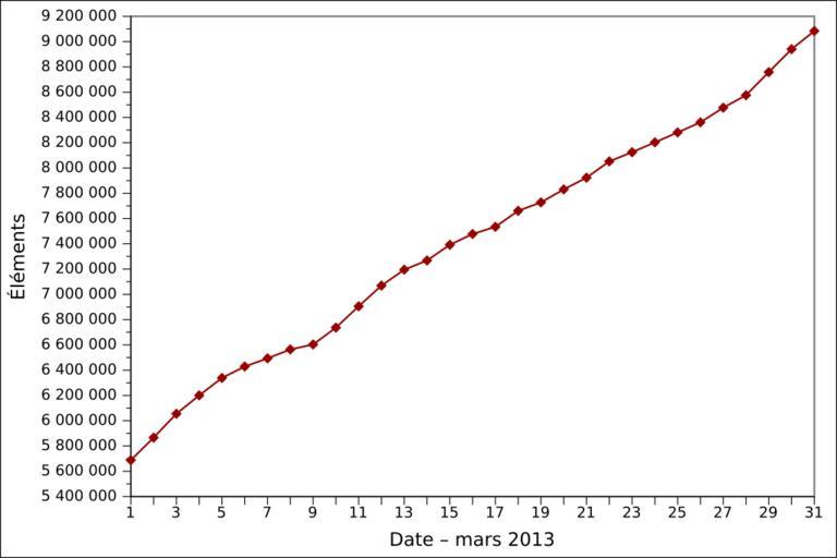 | Keywords: 2013-03 Wikidata items FR.svg de Grafische Darstellung des vollständigen Anzahls der angelegten Gegenstände auf Wikidata in März 2013 auf Französisch Löschungen werden nicht berücksichtigt en Graph presenting the total number of items created on Wikidata as of March 2013 in French Item deletions are not taken into account fr Graphique en français représentant le nombre total d'éléments créés sur Wikidata en mars 2013 Les suppressions d'éléments ne sont pas prises en compte 2013-04-01 21 27 own Ljubinka cc-zero File 2013-03 Wikidata items DE svg File 2013-03 Wikidata items EN svg Wikidata statistics in March 2013 Wikidata statistics in French |