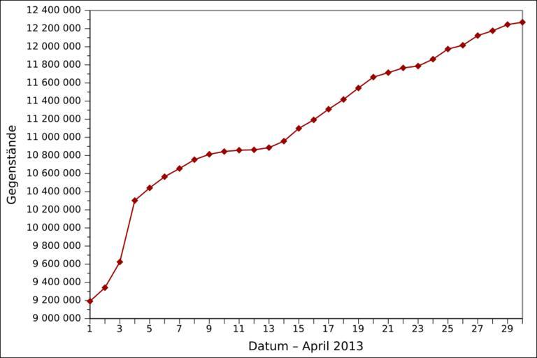 Keywords: 2013-04 Wikidata items DE.svg de Grafische Darstellung des vollständigen Anzahls der angelegten Gegenstände auf Wikidata in April 2013 auf Deutsch Löschungen werden nicht berücksichtigt en Graph presenting the total number of items created on Wikidata as of April 2013 in German Item deletions are not taken into account fr Graphique en allemand représentant le nombre total d'éléments créés sur Wikidata en avril 2013 Les suppressions d'éléments ne sont pas prises en compte 2013-05-04 13 44 own Ljubinka cc-zero en yes File 2013-04 Wikidata items EN svg fr yes File 2013-04 Wikidata items FR svg Wikidata statistics in April 2013 Wikidata statistics in German