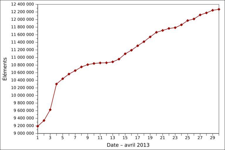 | Keywords: 2013-04 Wikidata items FR.svg de Grafische Darstellung des vollständigen Anzahls der angelegten Gegenstände auf Wikidata in April 2013 auf Französisch Löschungen werden nicht berücksichtigt en Graph presenting the total number of items created on Wikidata as of April 2013 in French Item deletions are not taken into account fr Graphique en français représentant le nombre total d'éléments créés sur Wikidata en avril 2013 Les suppressions d'éléments ne sont pas prises en compte 2013-05-04 13 44 own Ljubinka cc-zero File 2013-04 Wikidata items DE svg File 2013-04 Wikidata items EN svg Wikidata statistics in April 2013 Wikidata statistics in French |