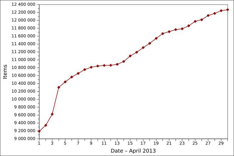 | Keywords: 2013-04 Wikidata items EN.svg de Grafische Darstellung des vollständigen Anzahls der angelegten Gegenstände auf Wikidata in April 2013 auf Englisch Löschungen werden nicht berücksichtigt en Graph presenting the total number of items created on Wikidata as of April 2013 in English Item deletions are not taken into account fr Graphique en anglais représentant le nombre total d'éléments créés sur Wikidata en avril 2013 Les suppressions d'éléments ne sont pas prises en compte 2013-05-04 13 44 own Ljubinka cc-zero File 2013-04 Wikidata items DE svg File 2013-04 Wikidata items FR svg Wikidata statistics in April 2013 Wikidata statistics in English |