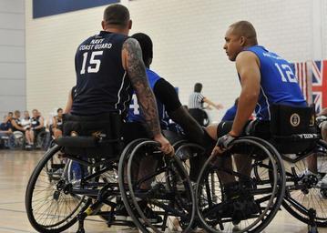 Keywords: 2013 Warrior Games Wheelchair Basketball 130414-N-DT940-507.jpg en Team Navy/Coast Guard member retired Aviation Electrician's Mate Steven Davis of Turlock Calif blocks opposing team members in a wheelchair basketball game against Team Air Force during the 2013 Warrior Games May 14 The Warrior Games includes competitions in archery cycling seated volleyball shooting swimming track and field and wheelchair basketball The goal of the Warrior Games is not necessarily to identify the most skilled athletes but rather to demonstrate the incredible potential of wounded warriors through competitive sports More than 200 wounded ill or injured service members from the U S and U K armed forces are scheduled to compete in the Paralympics-style competition May 11-16 U S Navy photo by Mass Communication Specialist 1st Class Erica R Gardner/Released 2013-05-14 Petty Officer 1st Class Erica R Gardner https //www dvidshub net/image/932384 130414-N-DT940-507 2013-05-15 13 53 COLORADO SPRINGS CO US PD-USGov-Military-Navy 2013 Warrior Games Images from DoD uploaded by Fæ |