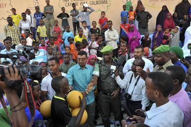 Keywords: people crowd Shangani District Commissioner, Said Abdullahi Said, Assistant Superintendent Ahmed Jagaba represent Acting AMISOM Police Commissioner hand over balls to young players at the end of a football match organised and supported by AMISOM Police Component held in Shangani district, Mogadishu, Somalia on March 09, 2015. AMISOM Photo / Ilyas Ahmed Shangani District Commissioner, Said Abdullahi Said, Assistant Superintendent Ahmed Jagaba represent Acting AMISOM Police Commissioner hand over balls to young players at the end of a football match organised and supported by AMISOM Police Component held in Shangani district, Mogadishu, Somalia on March 09, 2015. AMISOM Photo / Ilyas Ahmed 2015 03 09 Shangani Football Match-8 (16772169575).jpg en Shangani District Commissioner Said Abdullahi Said Assistant Superintendent Ahmed Jagaba represent Acting AMISOM Police Commissioner hand over balls to young players at the end of a football match organised and supported by AMISOM Police Component held in Shangani district Mogadishu Somalia on March 09 2015 AMISOM Photo / Ilyas Ahmed 2015-03-09 17 33 40 https //www flickr com/photos/au_unistphotostream/16772169575/ Flickr en AMISOM Public Information AMISOM Public Information https //flickr com/photos/61765479 N08/16772169575 2015-11-28 09 12 46 cc-zero cc-0 Photographs by the African Union Mission to Somalia Association football in Somalia Shangani District Commissioner, Said Abdullahi Said, Assistant Superintendent Ahmed Jagaba represent Acting AMISOM Police Commissioner hand over balls to young players at the end of a football match organised and supported by AMISOM Police Component held in Shangani district, Mogadishu, Somalia on March 09, 2015. AMISOM Photo / Ilyas Ahmed |
