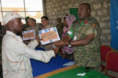 | Keywords: Brigadier Sam Kavuma (right) the Acting Force Commander and Commander of the Ugandan contingent in Somalia hands over a certificate of completion to one of the Somalia National Army soldiers who completed a three months training in military intelligence and Non-Commissioned Officers' course on 25 March 2015. AMISOM Photo / Raymond Baguma Brigadier Sam Kavuma (right) the Acting Force Commander and Commander of the Ugandan contingent in Somalia hands over a certificate of completion to one of the Somalia National Army soldiers who completed a three months training in military intelligence and Non-Commissioned Officers' course on 25 March 2015. AMISOM Photo / Raymond Baguma 2015 03 25 SNA PASSOUT-9 (16719205367).jpg en Brigadier Sam Kavuma right the Acting Force Commander and Commander of the Ugandan contingent in Somalia hands over a certificate of completion to one of the Somalia National Army soldiers who completed a three months training in military intelligence and Non-Commissioned Officers' course on 25 March 2015 AMISOM Photo / Raymond Baguma 2015-03-25 11 29 40 https //www flickr com/photos/au_unistphotostream/16719205367/ Flickr en AMISOM Public Information AMISOM Public Information https //flickr com/photos/61765479 N08/16719205367 2015-11-28 09 14 30 cc-zero cc-0 Photographs by the African Union Mission to Somalia Sam Kavuma Brigadier Sam Kavuma (right) the Acting Force Commander and Commander of the Ugandan contingent in Somalia hands over a certificate of completion to one of the Somalia National Army soldiers who completed a three months training in military intelligence and Non-Commissioned Officers' course on 25 March 2015. AMISOM Photo / Raymond Baguma |