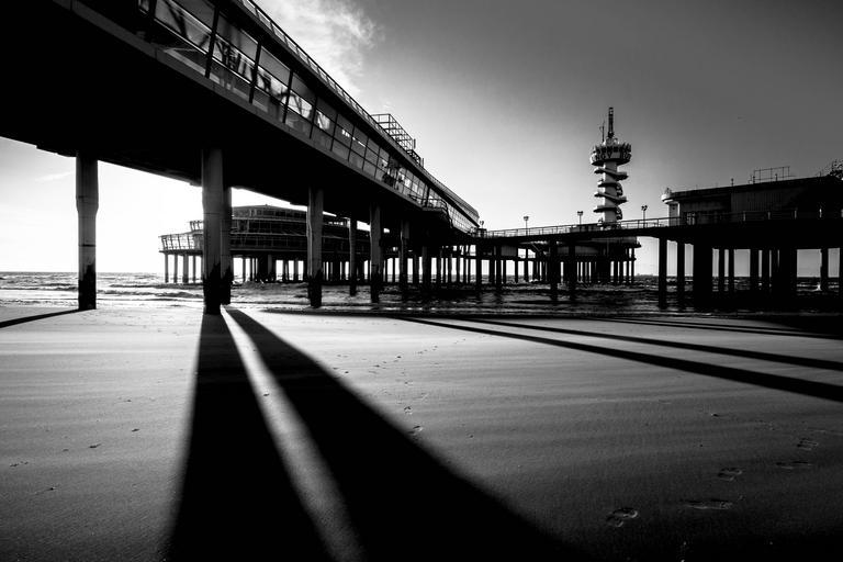 Keywords: blackandwhite monochrome night pier water road bridge architecture infrastructure city building building structure outdoor skyline photo border depth of field overpass dusk black and white Scheveningen Scheveningen