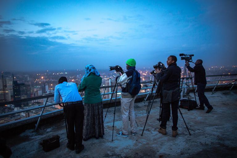 Keywords: kenya nairobi capital skyline sunset dusk night rooftop panorama city centre urban downtown central business district commerce kenyatta international conference kicc outdoor KENYA, Nairobi: A photograph taken by Make It Kenya 10 June 2015, shows a group of photography students on the top of the Kenyatta International Conference Centre (KICC) capturing the changing light of the Nairobi skyline as the sun sets over the Kenyan capital. MANDATORY CREDIT: MAKE IT KENYA PHOTO / STUART PRICE. KENYA, Nairobi: A photograph taken by Make It Kenya 10 June 2015, shows a group of photography students on the top of the Kenyatta International Conference Centre (KICC) capturing the changing light of the Nairobi skyline as the sun sets over the Kenyan capital. MANDATORY CREDIT: MAKE IT KENYA PHOTO / STUART PRICE.