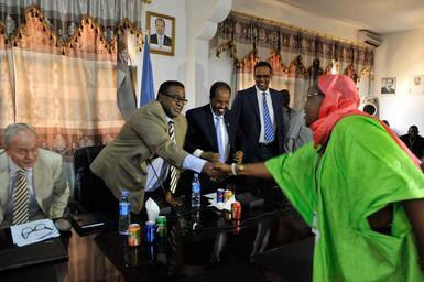 | Keywords: The Deputy Special Representative of the Chairperson of the African Union Commission (DSRCC) for Somalia, Lydia Wanyoto, shakes hands with the President of Somalia, Hassan Sheikh Mohamoud, and The Prime Minister of Somalia, Omar Abdirashid Ali Sharmarke, during the Signing Ceremony for the Formation of Somalia's Federal State of Hiran and Middle Shabelle in Mogadishu, Somalia, on August 8, 2015. AMISOM Photo/Omar Abdisalan The Deputy Special Representative of the Chairperson of the African Union Commission (DSRCC) for Somalia, Lydia Wanyoto, shakes hands with the President of Somalia, Hassan Sheikh Mohamoud, and The Prime Minister of Somalia, Omar Abdirashid Ali Sharmarke, during the Signing Ceremony for the Formation of Somalia's Federal State of Hiran and Middle Shabelle in Mogadishu, Somalia, on August 8, 2015. AMISOM Photo/Omar Abdisalan |