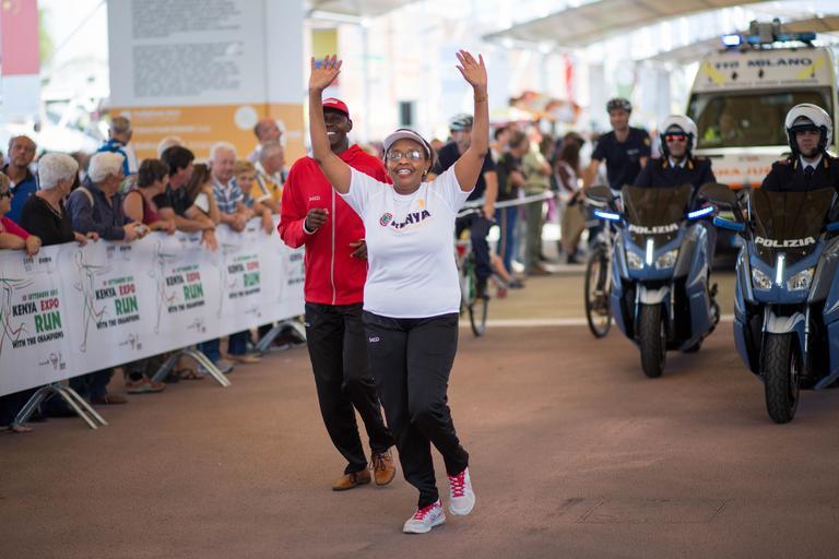 Keywords: kenya italy milan expo 2015 traditional singing dancing song dance race marathon athletes runners run 3km 10km music celebration showcase world coffee nation tourism investment ITALY, Milan: In a photograph taken by Make It Kenya 10 September 2015, Hon. Phyllis Kandie, Minister for East Afrian Affairs, Commerce and Tourism (MEAACT) approaches the finish line of a 3km family fun run as part of a number of events held in Milan this week to mark the Kenyan Week celebrations at Expo Milan 2015, a universal exhibition and platform for the exchange of ideas and shared solutions on the theme of food. MANDATORY CREDIT: MAKE IT KENYA PHOTO / STUART PRICE. ITALY, Milan: In a photograph taken by Make It Kenya 10 September 2015, Hon. Phyllis Kandie, Minister for East Afrian Affairs, Commerce and Tourism (MEAACT) approaches the finish line of a 3km family fun run as part of a number of events held in Milan this week to mark the Kenyan Week celebrations at Expo Milan 2015, a universal exhibition and platform for the exchange of ideas and shared solutions on the theme of food. MANDATORY CREDIT: MAKE IT KENYA PHOTO / STUART PRICE. |