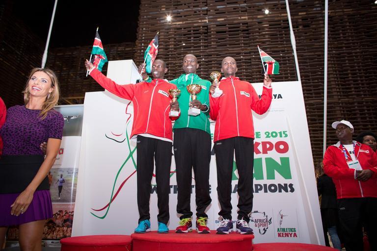 Keywords: kenya italy milan expo 2015 traditional singing dancing song dance race marathon athletes runners run 3km 10km music celebration showcase world coffee nation tourism investment ITALY, Milan: In a photograph taken by Make It Kenya 10 September 2015, Thomas James Lokomwa (centre), winner of the men's Kenya Expo 'Run With The Champions' 10km race held at Expo Milan 2015, stands with second place Geoffrey Kiprono Ngetich (left) and third place Silas Muturi Gichovi (right) on the podium having received their trophies. The race, along with a family 3km fun-run which took place earlier in the day, was one of a number of events held in Milan this week to mark the Kenyan Week celebrations at Expo Milan 2015, a universal exhibition and platform for the exchange of ideas and shared solutions on the theme of food. MANDATORY CREDIT: MAKE IT KENYA PHOTO / STUART PRICE. ITALY, Milan: In a photograph taken by Make It Kenya 10 September 2015, Thomas James Lokomwa (centre), winner of the men's Kenya Expo 'Run With The Champions' 10km race held at Expo Milan 2015, stands with second place Geoffrey Kiprono Ngetich (left) and third place Silas Muturi Gichovi (right) on the podium having received their trophies. The race, along with a family 3km fun-run which took place earlier in the day, was one of a number of events held in Milan this week to mark the Kenyan Week celebrations at Expo Milan 2015, a universal exhibition and platform for the exchange of ideas and shared solutions on the theme of food. MANDATORY CREDIT: MAKE IT KENYA PHOTO / STUART PRICE. |