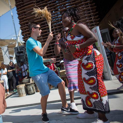Keywords: kenya italy milan expo 2015 traditional singing dancing song dance race marathon athletes runners run 3km 10km music celebration showcase world coffee nation tourism investment ITALY, Milan: In a photograph taken by Make It Kenya 10 September 2015, a member of the public joins Kenyans as they perform traditional dance for a gathered audience outside the Kenya Pavilion as part of Kenyan Week celebrations at Expo Milan 2015, a universal exhibition and platform for the exchange of ideas and shared solutions on the theme of food. A number of events were held in Milan to mark the occasion, incluing a 3km family fun run completed by Hon. Phyllis Kandie, Minister for East Afrian Affairs, Commerce and Tourism (MEAACT) and the Kenya Expo Run With The Champions 10km race in which some of Kenyans top athletes competed against professional and enthusiast runners alike. MANDATORY CREDIT: MAKE IT KENYA PHOTO / STUART PRICE. ITALY, Milan: In a photograph taken by Make It Kenya 10 September 2015, a member of the public joins Kenyans as they perform traditional dance for a gathered audience outside the Kenya Pavilion as part of Kenyan Week celebrations at Expo Milan 2015, a universal exhibition and platform for the exchange of ideas and shared solutions on the theme of food. A number of events were held in Milan to mark the occasion, incluing a 3km family fun run completed by Hon. Phyllis Kandie, Minister for East Afrian Affairs, Commerce and Tourism (MEAACT) and the Kenya Expo Run With The Champions 10km race in which some of Kenyans top athletes competed against professional and enthusiast runners alike. MANDATORY CREDIT: MAKE IT KENYA PHOTO / STUART PRICE.