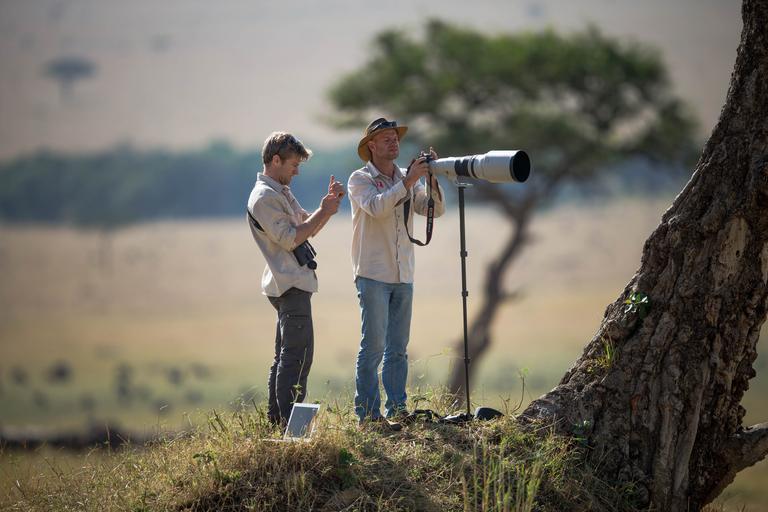 | Keywords: outdoor KENYA, Masai Mara: In a photograph taken by Make It Kenya 03 October 2015, Andre Van Kets (left) and Carel Verhoef (with camera) co-founders of HerdTracker prepare for a live broadcast on the Twitter application Periscope below the Oloololo Escarpment in the Mara Triangle, part of Kenya's wider Masai Mara ecosystem. During the months of July through to October, one of nature's greatest events takes place in the Mara when hundreds of thousands of wildebeest, zebra and other ungulates migrate northwards from Tanzania's Serengeti in search of fresh pasture and grazing, before turning and heading south again in a journey that covers thousands of kilometres and is known as one of the seven natural wonders of the world, making it a major draw for wildlife enthusiasts and tourists from around the globe. MANDATORY CREDIT: MAKE IT KENYA PHOTO / STUART PRICE. KENYA, Masai Mara: In a photograph taken by Make It Kenya 03 October 2015, Andre Van Kets (left) and Carel Verhoef (with camera) co-founders of HerdTracker prepare for a live broadcast on the Twitter application Periscope below the Oloololo Escarpment in the Mara Triangle, part of Kenya's wider Masai Mara ecosystem. During the months of July through to October, one of nature's greatest events takes place in the Mara when hundreds of thousands of wildebeest, zebra and other ungulates migrate northwards from Tanzania's Serengeti in search of fresh pasture and grazing, before turning and heading south again in a journey that covers thousands of kilometres and is known as one of the seven natural wonders of the world, making it a major draw for wildlife enthusiasts and tourists from around the globe. MANDATORY CREDIT: MAKE IT KENYA PHOTO / STUART PRICE.  |