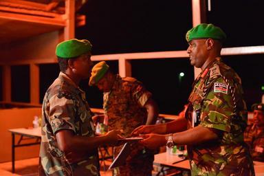 | Keywords: The Force Commander of the African Union Mission in Somalia (AMISOM), Lt. Gen. Jonathan Rono, hands a certificate to a Soldier from one of four Troop Contributing Countries (TCC) and one Mission Supporting Country (MSC), serving under African Union Mission in Somalia (AMISOM), during a farewell ceremony to mark the end of their tour of duty in Somalia on October 31, 2015. AMISOM Photo/Omar Abdisalann The Force Commander of the African Union Mission in Somalia (AMISOM), Lt. Gen. Jonathan Rono, hands a certificate to a Soldier from one of four Troop Contributing Countries (TCC) and one Mission Supporting Country (MSC), serving under African Union Mission in Somalia (AMISOM), during a farewell ceremony to mark the end of their tour of duty in Somalia on October 31, 2015. AMISOM Photo/Omar Abdisalann |