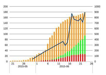 | Keywords: 2015 MERS in South Korea2.svg en Orange bar patients; Green bar cured; Red bar deaths; Blue line isolated right ja 橙棒:治療中 緑棒:生還 赤棒:死去 線(右目盛):病院隔離 2015-06-20 own Akaniji other versions cc-zero Data table wikitable colspan 2 rowspan 2 Date colspan 4 Cases colspan 2 Quarantined rowspan 2 refs <ref>http //www mw go kr/front_new/al/sal0301ls jsp PAR_MENU_ID 04 MENU_ID 0403</ref><ref name mwgokr323404>http //www mw go kr/front_new/al/sal0301vw jsp PAR_MENU_ID 04 MENU_ID 0403 CONT_SEQ 323404</ref> - total Patients Cured Deaths Isolated total - rowspan 12 May 20 2 2 0 0 - 21 3 3 0 0 64 <ref>Paul Tait UPDATE 3-South Korea confirms third case of MERS virus; 64 isolated Reuters May 21 2015 4 48am EDT http //www reuters com/article/2015/05/21/health-mers-southkorea-idUSL3N0YC15220150521 </ref> - 22 3 3 0 0 - 23 3 3 0 0 - 24 3 3 0 0 - 25 3 3 0 0 - 26 5 5 0 0 - 27 5 5 0 0 - 28 7 7 0 0 - 29 13 13 0 0 120 <ref>AFP News S Korea confirms 12 MERS cases Yahoo News Singapore Fri May 29 2015 https //sg news yahoo com/korea-reports-three-mers-cases-093430653 html </ref><ref>Jung Min-ho Korean diagnosed with MERS in China Korea Times May 29 2015 http //www koreatimes co kr/www/news/nation/2015/05/116_179826 html </ref> - 30 15 15 0 0 42 <ref>Kim Se-jeong MERS cases rise to 15; soldier quarantined Korea Times 2015-05-31 17 08 2015-05-31 21 55 updated http //www koreatimes co kr/www/news/nation/2015/06/116_179897 html </ref> - 31 18 18 0 0 - rowspan 23 June 1 25 24 0 1 682 <ref>Nearly 700 Quarantined Over Lethal MERS Virus skyNEWS Sky UK 16 47 UK 01 June 2015 http //news sky com/story/1494407/nearly-700-quarantined-over-lethal-mers-virus </ref> - 2 30 29 0 1 791 <ref name kjd150604>KIM BONG-MOON Schools choose to close as MERS keeps spreading Korea JoongAng Daily June 04 2015 http //koreajoongangdaily joins com/news/article/Article aspx aid 3004971 </ref> - 3 30 27 0 3 1364 <ref name kjd150604 /> - 4 36 32 0 4 164 1667 <ref>Xinhua MERS infections in S Korea keep rising to 35 in two weeks Shanghai Daily Jun 04 2015 http //www shanghaidaily com/article/article_xinhua aspx id 285708 </ref> - 5 42 36 1 5 1820 <ref>Jean Noh S Korea's NEW holds film release over Mers outbreak ScreenDaily 5 June 2015 http //www screendaily com/screenasia/s-koreas-new-holds-film-release-over-mers-outbreak/5089107 article </ref> - 6 64 58 1 5 1801 <ref>Reuters Jeremy Laurence South Korea reports nine new MERS cases one recovers and leaves hospital Channel NewsAsia 06 Jun 2015 13 10 http //www channelnewsasia com/news/asiapacific/south-korea-reports-nine/1896498 html </ref> - 7 87 81 1 5 2508 <ref>Yamei Wang Central municipal authorities in S Korea to cooperate in tackling MERS Xinhua English news cn 2015-06-07 17 48 38 http //news xinhuanet com/english/2015-06/07/c_134304733 htm </ref> - 8 95 86 2 7 2892 <ref name reuters150609>Ju-min Park and James Pomfret Hong Kong issues 'red alert' against South Korea travel due to MERS Reuters Jun 9 2015 4 30pm EDT http //www reuters com/article/2015/06/09/health-mers-southkorea-idUSKBN0ON02D20150609 </ref> - 9 108 98 3 7 3439 <ref name reuters150609 /> - 10 122 109 4 9 3805 <ref name afp1506121040>Agence France-Presse Number of New MERS Cases in South Korea Falling Government NDTV June 12 2015 10 40 IST http //www ndtv com/world-news/number-of-new-mers-cases-in-south-korea-falling-government-770970 </ref> - 11 126 109 7 10 3680 <ref name afp1506121040 /> - 12 138 116 9 13 4000 <ref>Jack Kim WHO says South Korea's MERS outbreak large and complex Reuters Jun 13 2015 2 07pm BST http //uk reuters com/article/2015/06/13/uk-health-mers-southkorea-idUKKBN0OS2HE20150613 </ref> - 13 145 121 10 14 365 4856 <ref>Jack Kim Hospital at centre of South Korea's MERS suspends services; seven new cases Reuters Jun 14 2015 8 47am BST http //uk reuters com/article/2015/06/14/uk-health-mers-southkorea-idUKKBN0OT0XP20150614 </ref> - 14 150 120 14 16 291 5216 <ref name mwgokr323404 /> - 15 154 118 17 19 348 5586 - 16 162 124 19 19 598 6508 - 17 165 118 24 23 872 6729 - 18 166 112 30 24 769 5930 - 19 166 106 36 24 752 5197 - 20 169 101 43 25 739 4035 - 21 172 95 50 27 785 3833 - 22 175 94 54 27 714 2805 - 23 179 85 67 27 896 3103 Notes <references /> Uploaded with UploadWizard MERS 2015 in South Korea |