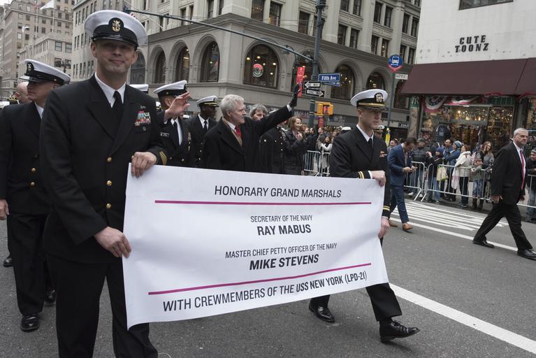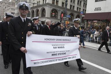 Keywords: 2015 Veterans Day parade 151111-N-LV331-002.jpg en 151111-N-LV331-002 NEW YORK Nov 11 2015 Honorary grand marshals of the 2015 Veterans Day parade Secretary of the Navy SECNAV Ray Mabus and Master Chief Petty Officer of the Navy MCPON Mike Stevens wave to New Yorkers as they march with Sailors down 5th Avenue Mabus and the crew of USS New York LPD 21 joined more than 400 local Sailors in marching down 5th avenue to represent the U S Navy as the featured service for this year's parade U S Navy photo by Mass Communication Specialist 2nd Class Armando Gonzales/Released Unit Navy Media Content Services DVIDS Tags Secretary of the Navy; Ray Mabus; power; travel; budget; presence; partnerships; spending; Navy; people; government; SECNAV; Marine Corps; NMCS; DVIDS Bulk Import 2015-11-11 Armando Gonzales https //www dvidshub net/image/2293084/2015-veterans-day-parade 151111-N-LV331-002 2015-11-18 00 21 NEW YORK NY US PD-USGov-Military-Navy Ray Mabus Veterans Day 2015 USS New York LPD-21 Images from DoD uploaded by Fæ