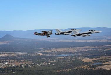 | Keywords: royal australian air force royalaustralianairforce air-to-air airtoair aircraft a44 f/a-18f super hornet a44fa18fsuperhornet raaf base amberley raafbaseamberley queensland australia aus outdoor A formation flight with No 1 Squadron (1SQN) F/A-18F Super Hornets and a Bristol F2B Fighter (aircraft flown by 1SQN in World War 1) commemorates the SQN’s Centenary and marked 1SQN's first operational sorties on 12 June 1916. The Bristol F2B Fighter was provided by TAVAS (WWI vintage aircraft society) and flown by Jack McDonald. The Bristol was painted in WWI-era 1SQN colours and had the tail number B1229. The tail number was flown by Ross McPherson Smith who achieved 10 of his 11 victories in this aircraft. A formation flight with No 1 Squadron (1SQN) F/A-18F Super Hornets and a Bristol F2B Fighter (aircraft flown by 1SQN in World War 1) commemorates the SQN’s Centenary and marked 1SQN's first operational sorties on 12 June 1916. The Bristol F2B Fighter was provided by TAVAS (WWI vintage aircraft society) and flown by Jack McDonald. The Bristol was painted in WWI-era 1SQN colours and had the tail number B1229. The tail number was flown by Ross McPherson Smith who achieved 10 of his 11 victories in this aircraft. |