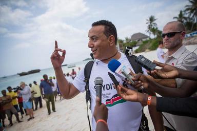 | Keywords: outdoor KENYA, Watamu: In a photograph taken by Make It Kenya 17 January 2016, Kenya's Cabinet Secretary for Tourism Hon. Najib Balala gestures while speaking to the media following his arrival in the coastal town of Watamu by parachute after skydiving out of a plane from approx. 11,000ft. Kenya's famous wildlife and beautiful tropical coastline is being showcased in a series of live web broadcasts using state-of–the-art technology. #KenyaLive has enabled people to witness the excitement of a night safari in the Mara in real time using specialist night-vision equipment and is now in Watamu highlighting the work of the turtle conservation organisation Local Ocean Trust, and other activities including stand-up paddle boarding with dolphins, snorkelling and scuba diving by using the scial media application Periscope. MAKE IT KENYA PHOTO / STUART PRICE. KENYA, Watamu: In a photograph taken by Make It Kenya 17 January 2016, Kenya's Cabinet Secretary for Tourism Hon. Najib Balala gestures while speaking to the media following his arrival in the coastal town of Watamu by parachute after skydiving out of a plane from approx. 11,000ft. Kenya's famous wildlife and beautiful tropical coastline is being showcased in a series of live web broadcasts using state-of–the-art technology. #KenyaLive has enabled people to witness the excitement of a night safari in the Mara in real time using specialist night-vision equipment and is now in Watamu highlighting the work of the turtle conservation organisation Local Ocean Trust, and other activities including stand-up paddle boarding with dolphins, snorkelling and scuba diving by using the scial media application Periscope. MAKE IT KENYA PHOTO / STUART PRICE. |