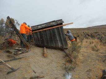 Keywords: history historic blmcalifornia california blmnevada nevada outdoors archaeology wildlife desert ranch preservation bureau of land management bureauoflandmanagement blmcareers outdoor careers outdoorcareers conservation past public lands publiclands heritage outdoor -Story and photo by Jen Rovanpera, Archaeologist for the BLM Applegate Field Office The BLM Applegate Field Office just completed stabilizing and preserving a 1930s root cellar on the historic Bitner Ranch located in Washoe County, Nevada. The root cellar was built in the 1930s to store food and other perishables. It consists of a large cavity (cellar) built into the side of a hill just east of the ranch house. Juniper poles were laid across the top of the cavity, the covered with hay from the nearby meadow. Dirt was then piled onto the roof into order to insulate it further. A small wooden structure with steps leads down into the cellar. Once inside, the maximum height of the cellar is about 6 feet. Shelving units were built along three of the walls. Little is known about the beginnings of Bitner Ranch. A structure in Badger Meadows appears on a survey map as early as 1873/1874; however the land was not patented from the state of Nevada until 1900. Based on the style of barbed wire, some of the older corrals and fences were probably built sometime between 1874 and 1892. The ranch hosts a ranch house, a black smith shop with a bunk house for workers, a milk barn, a root cellar, an outhouse, corrals, and a small animal pen. Most of the remaining structures on the property were built in the 1920s, except for the root cellar which was built in the 1930s and the milk barn which might be one of the oldest standing structures on the ranch. The Bureau of Land Management acquired the Bitner Ranch in 1995. Bitner Ranch is an excellent example of a high desert, homestead era ranch and one of the few remaining ranches to be managed by the Bureau of Land Management in northwestern Nevada. The goal is to preserve the historic ranch, continue research, and establish an interpretive center about the history and wildlife of the meadow. The preservation project included removing the dirt that had caved into the cellar through the collapsed roof, stabilizing the wooden structure, and rebuilding the steps into the cellar. The project was completed in two weeks by Jed Mauldin, Dane Mauldin, and Kody Smith of S.T. Rhoades Construction, Inc. Pictured here, the base of the wooden structure was completed rotted, so the structure was braced and then moved. The entryway was then re-built. -Story and photo by Jen Rovanpera, Archaeologist for the BLM Applegate Field Office The BLM Applegate Field Office just completed stabilizing and preserving a 1930s root cellar on the historic Bitner Ranch located in Washoe County, Nevada. The root cellar was built in the 1930s to store food and other perishables. It consists of a large cavity (cellar) built into the side of a hill just east of the ranch house. Juniper poles were laid across the top of the cavity, the covered with hay from the nearby meadow. Dirt was then piled onto the roof into order to insulate it further. A small wooden structure with steps leads down into the cellar. Once inside, the maximum height of the cellar is about 6 feet. Shelving units were built along three of the walls. Little is known about the beginnings of Bitner Ranch. A structure in Badger Meadows appears on a survey map as early as 1873/1874; however the land was not patented from the state of Nevada until 1900. Based on the style of barbed wire, some of the older corrals and fences were probably built sometime between 1874 and 1892. The ranch hosts a ranch house, a black smith shop with a bunk house for workers, a milk barn, a root cellar, an outhouse, corrals, and a small animal pen. Most of the remaining structures on the property were built in the 1920s, except for the root cellar which was built in the 1930s and the milk barn which might be one of the oldest standing structures on the ranch. The Bureau of Land Management acquired the Bitner Ranch in 1995. Bitner Ranch is an excellent example of a high desert, homestead era ranch and one of the few remaining ranches to be managed by the Bureau of Land Management in northwestern Nevada. The goal is to preserve the historic ranch, continue research, and establish an interpretive center about the history and wildlife of the meadow. The preservation project included removing the dirt that had caved into the cellar through the collapsed roof, stabilizing the wooden structure, and rebuilding the steps into the cellar. The project was completed in two weeks by Jed Mauldin, Dane Mauldin, and Kody Smith of S.T. Rhoades Construction, Inc. Pictured here, the base of the wooden structure was completed rotted, so the structure was braced and then moved. The entryway was then re-built.
