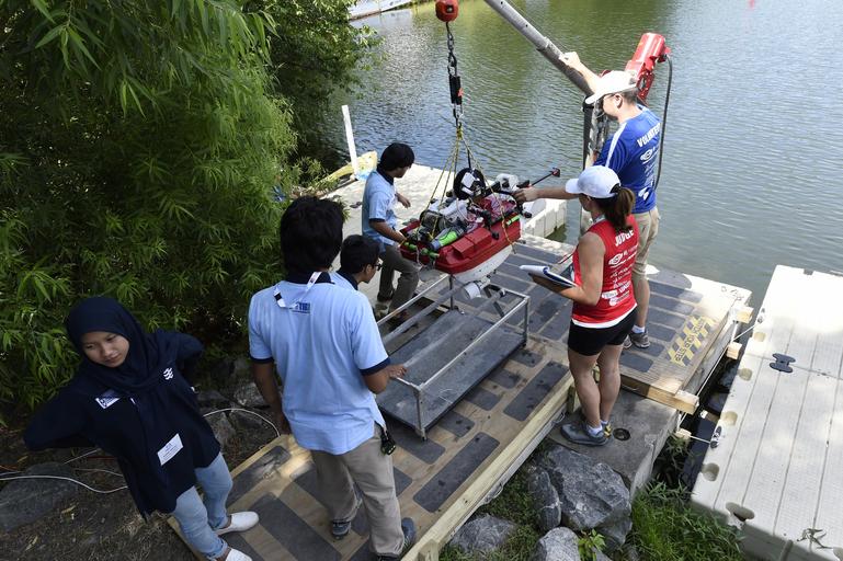 | Keywords: 2016 Interanational RoboBoat Competition 160709-N-PO203-146.jpg en 160709-N-PO203-146 VIRGINIA BEACH Va Jul 9 2016 Student team members from Universitas Indonesia have their robotic boat wieghed prior to a qualification run during the 9th annual AUVSI Foundation and Office of Naval Research-sponsored International RoboBoat competition held in Virginia Beach Virginia Student teams design autonomous robotic boats to navigate and race through an aquatic obstacle course U S Navy photo by John F Williams/Released <br>Unit Navy Media Content Services 2016-07-09 John Williams https //www dvidshub net/image/2716383/2016-interanational-roboboat-competition 160709-N-PO203-146 2016-07-12 00 07 VIRGINIA BEACH VA US PD-USGov-Military-Navy Office of Naval Research Images from DoD uploaded by Fæ |