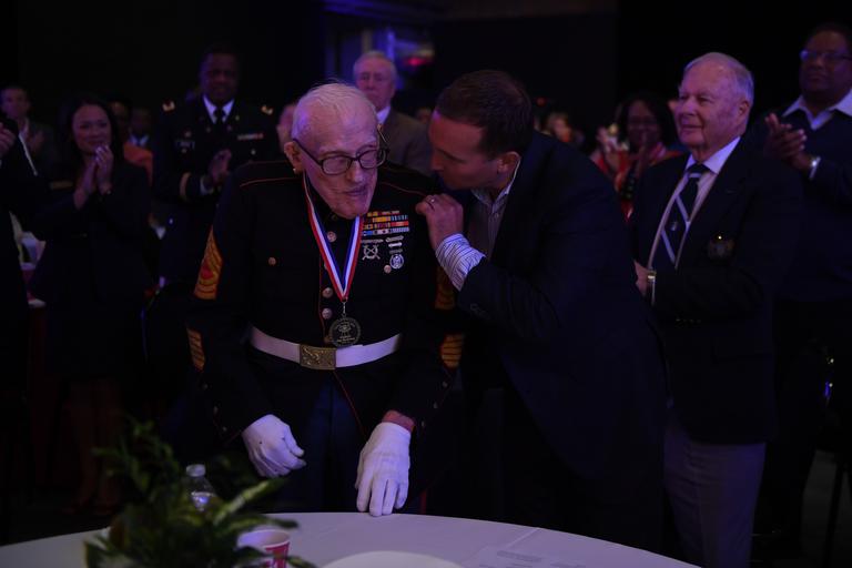 Keywords: 2016 Jacksonville Veterans Day Parade 161111-N-TP832-077.jpg en 161111-N-TP832-077 JACKSONVILLE Fla November 11 2016 The city of Jacksonville's Mayor Lenny Curry congratulates Master Sgt Harold Davis USMC Ret for being recognized as the 2016 Veterans Day Parade Oldest Veteran during the Mayor's Veterans Day Breakfast in Jacksonville U S Navy photo by Seaman Michael Lopez/Released Unit Navy Media Content Services DVIDS Tags jacksonville; us marine corps; florida; us navy; michael lopez; NMCS; veterans day weekend; DVIDS Bulk Import; tp832; mayor lenny curry 2016-11-11 Michael J Lopez https //www dvidshub net/image/2992728/2016-jacksonville-veterans-day-parade 161111-N-TP832-077 2016-11-16 00 44 JACKSONVILLE FL US PD-USGov-Military-Navy Veterans Day 2016 Images from DoD uploaded by Fæ